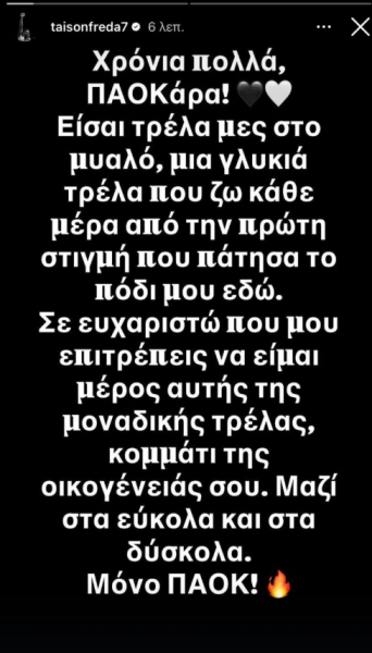 Ο Τάισον εξέφρασε τη χαρά και τη συγκίνησή του για τα 100 χρόνια του ΠΑΟΚ, στέλνοντας μήνυμα προς τον σύλλογο και τον κόσμο του Δικεφάλου. Ο Βραζιλιάνος μεσοεπιθετικός, που έχει «δεθεί» με την ομάδα και τη Θεσσαλονίκη, τόνισε ουσιαστικά τη σύνδεσή του με το κλίμα και την ατμόσφαιρα που έχει βρει στον ΠΑΟΚ, δείχνοντας πως αισθάνεται μέρος της ιστορίας και της νοοτροπίας του συλλόγου.