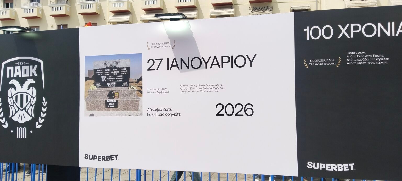 Στο ειδικά διαμορφωμένο πάνελ δεσπόζει η ημερομηνία «27 Ιανουαρίου», υπενθυμίζοντας τη μέρα που σημάδεψε για πάντα την οικογένεια του ΠΑΟΚ. Δίπλα, φωτογραφία του μνημείου που στήθηκε στη μνήμη των επτά φίλων της ομάδας λειτουργεί ως σιωπηλή υπενθύμιση ότι η ιστορία ενός συλλόγου δεν γράφεται μόνο μέσα στα γήπεδα.