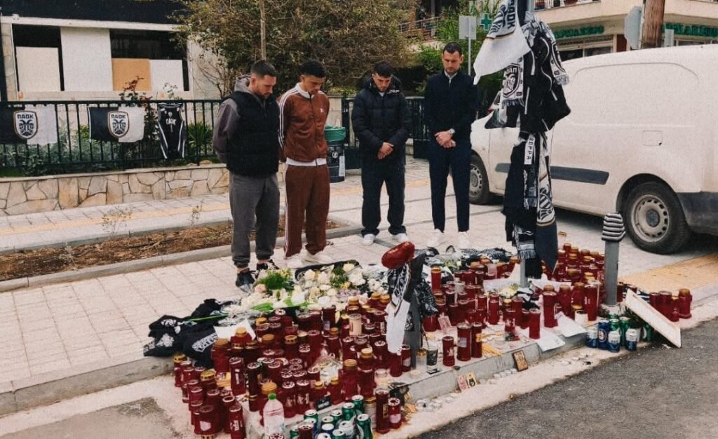 Λουλούδια και μια φανέλα άφησαν στο σημείο της δολοφονίας του Κλεομένη στην Καλαμαριά, άνθρωποι του ΠΑΟΚ, τιμώντας τη μνήμη του 20χρονου.