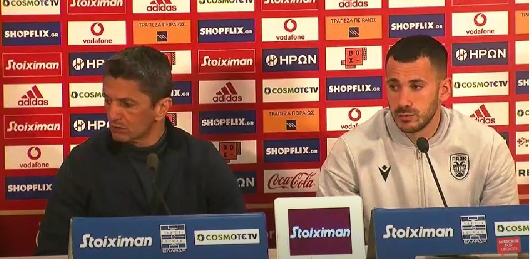 Για το ότι μένει εκτός διεκδίκησης του τίτλου: «Αυτή είναι η πίεση που θέλετε να μας βάλετε. Εμείς δεν είπαμε ποτέ για τέτοιον στόχο. Εμείς έχουμε πει ότι είμαστε σε περίοδο μετάβασης. Έχουν αρκετά νέα παιδιά που θα κάνουν λάθη. Καταφέραμε να έχουμε καλά αποτελέσματα και καλά παιχνίδια αλλά στο κρίσιμο σημείο της πίεσης και στα πλέον σημαντικά καταρρεύσαμε ή καταρρέαμε και κάναμε λάθη. Το ματς με την ΑΕΚ είναι σαν… αντίγραφο με το σημερινό. Ο στόχος είναι το ματς της Κυριακής. Είμαστε απογοητευμένοι αλλά είπα στα παιδιά να σηκώσουμε κεφάλι και να αντιδράσουμε. Να νικήσουμε στο επόμενο ματς. Έχουμε ωραίες προκλήσεις μπροστά μας»