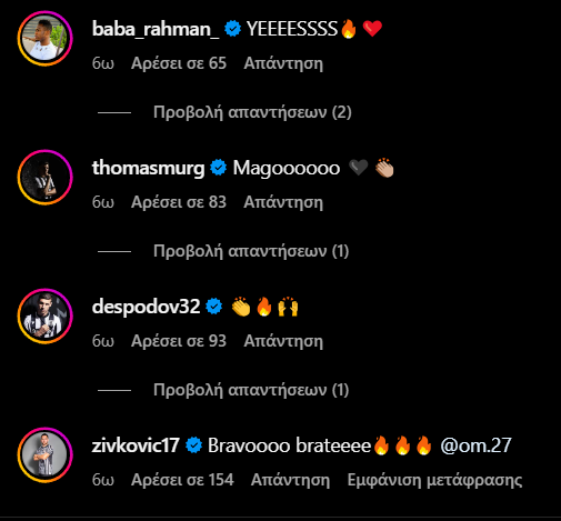 Στη συνέχεια, ο Οζντόεφ έκανε μία ανάρτηση στο Instagram με μία φωτογραφία από τη φάση που μόλις είχε σκοράρει στην OPAP Arena, βάζοντας ως λεζάντα μία άσπρη και μία μαύρη καρδιά και από κάτω σχολιάζουν οι συμπαίκτες του, πέρα από τους οπαδούς της ομάδας.