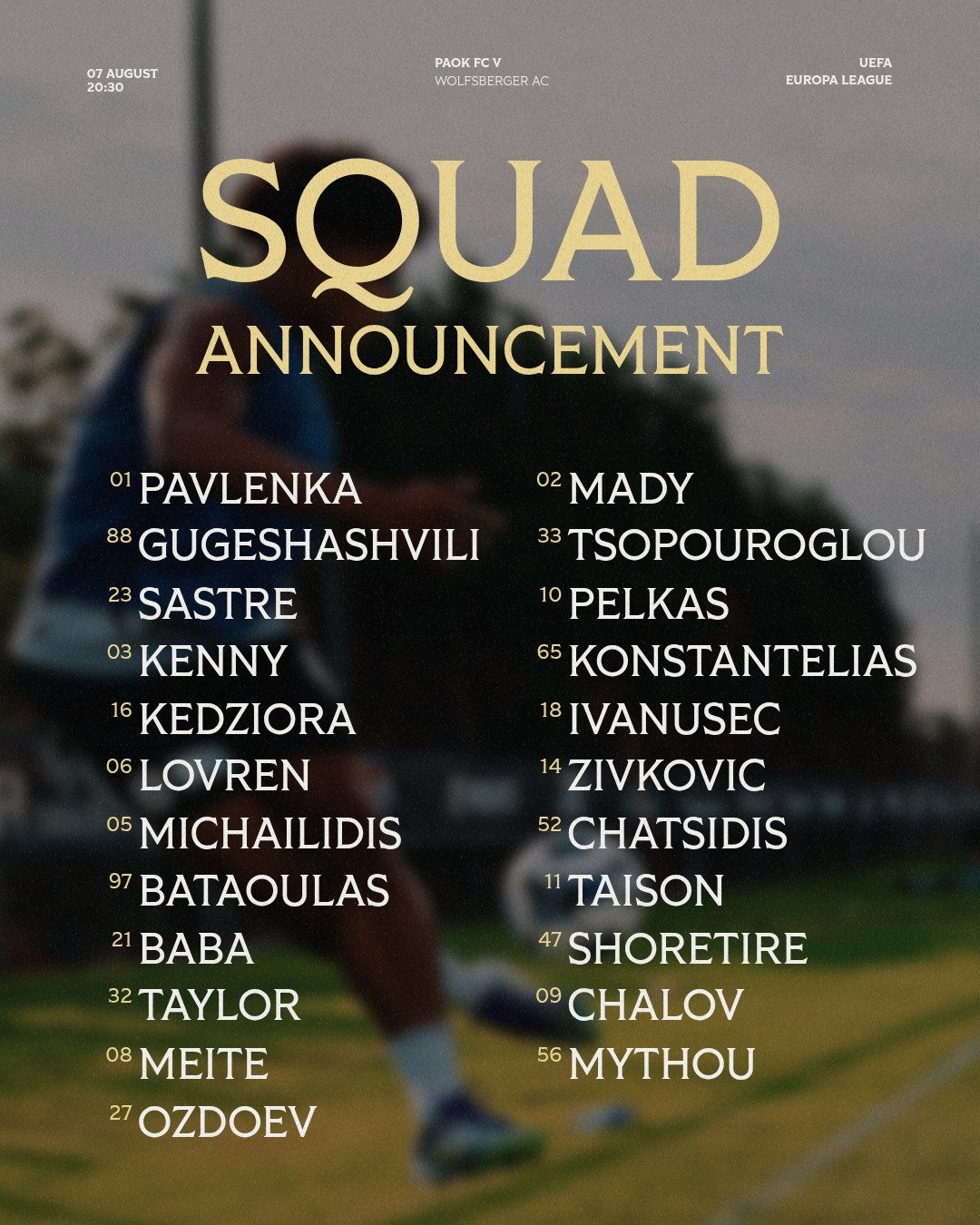 Αναλυτικά η αποστολή του ΠΑΟΚ για το εντός έδρας παιχνίδι με τη Βόλφσμπεργκερ αποτελείται από τους: