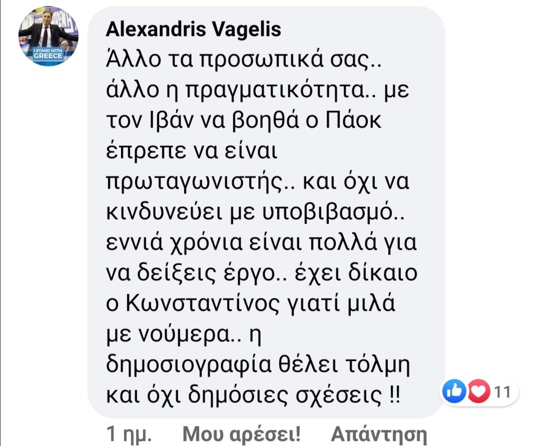 Με τον γνωστό προπονητή, Βαγγέλη Αλεξανδρή να τάσσεται υπέρ του πρώην του διευθύνοντα συμβούλου της “ασπρόμαυρης” ΚΑΕ γράφοντας χαρακτηριστικά: “Με τον Ιβάν να βοηθά ο ΠΑΟΚ έπρεπε να είναι πρωταγωνιστής.. και όχι να κινδυνεύει με υποβιβασμό.. εννιά χρόνια είναι πολλά για να δείξεις έργο.. έχει δίκαιο ο Κωνσταντίνος γιατί μιλά με νούμερα..”.