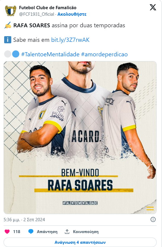 Ο Ράφα Σοάρες αποχωρεί οριστικά από τον ΠΑΟΚ, καθώς η μεταγραφή του στη Φαμαλικάο πήρε επίσημη μορφή. Ο Πορτογάλος αριστερός μπακ αποχαιρέτησε τους συμπαίκτες του και υπέγραψε διετές συμβόλαιο με την ομάδα της πατρίδας του, ολοκληρώνοντας τη θητεία του στη Θεσσαλονίκη. Η αποχώρησή του είχε δρομολογηθεί τις τελευταίες ημέρες και πλέον ανακοινώθηκε επίσημα από τη Φαμαλικάο.