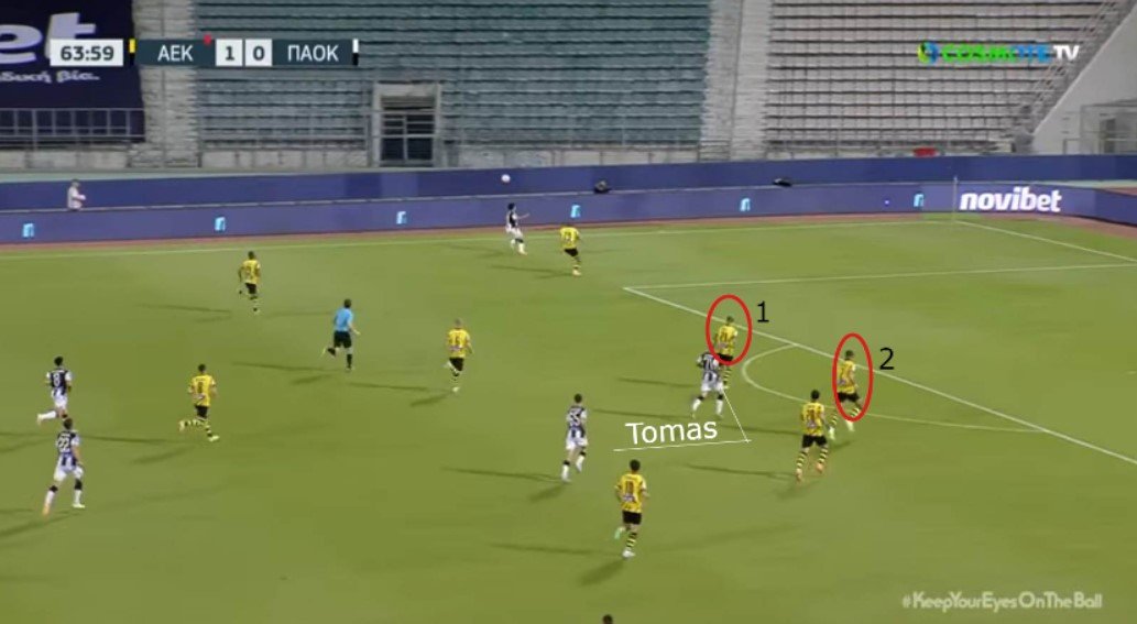 Στα αρχικά πλάνα του ΠΑΟΚ η επιλογή του Τόμας θα μπορούσε να χαρακτηριστική εξαιρετική. Όμως με την αλλαγή των δεδομενών και τον ΠΑΟΚ να αγωνίζεται με παίκτη περισσότερο και να προσπαθεί να ανοίξει μια κλειστεί άμυνα χωρίς να έχει έναν φορ που να θεωρείται αυτό που λένε “κολώνα” μέσα στην μεγάλη περιοχή, προκειμένου να παλέψει με τους δύο δυνατούς κεντρικούς αμυντικούς ΑΕΚ.