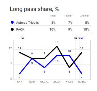 Η παραπάνω φωτογραφία  επιβεβαιώνει όλα τα οποία αναφέραμε πιο πάνω. Από το 76′ μέχρι και το τέλος του ματς ο Αστέρας προχώρησε σε μόλις 4 μακρινές μεταβιβάσεις  και ο ΠΑΟΚ από την άλλη που είναι η ομάδα που παίζει με χτίσιμο των επιθέσεων από την άμυνα (Build-Up) έκανε  11 !!!
