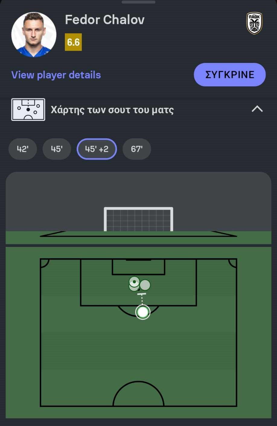 Στις επιθετικές του προσπάθειες, ο Τσάλοφ πραγματοποίησε τέσσερα σουτ, εκ των οποίων μόνο ένα βρήκε στόχο, αλλά αποκρούστηκε από τον αντίπαλο τερματοφύλακα. Οι υπόλοιπες δύο προσπάθειες κατέληξαν εκτός εστίας, ενώ μία αποκρούστηκε από την άμυνα. Εντυπωσιακή ήταν η προσπάθεια που χτύπησε στο δοκάρι, δείχνοντας πόσο κοντά βρέθηκε στο να ανοίξει το σκορ.