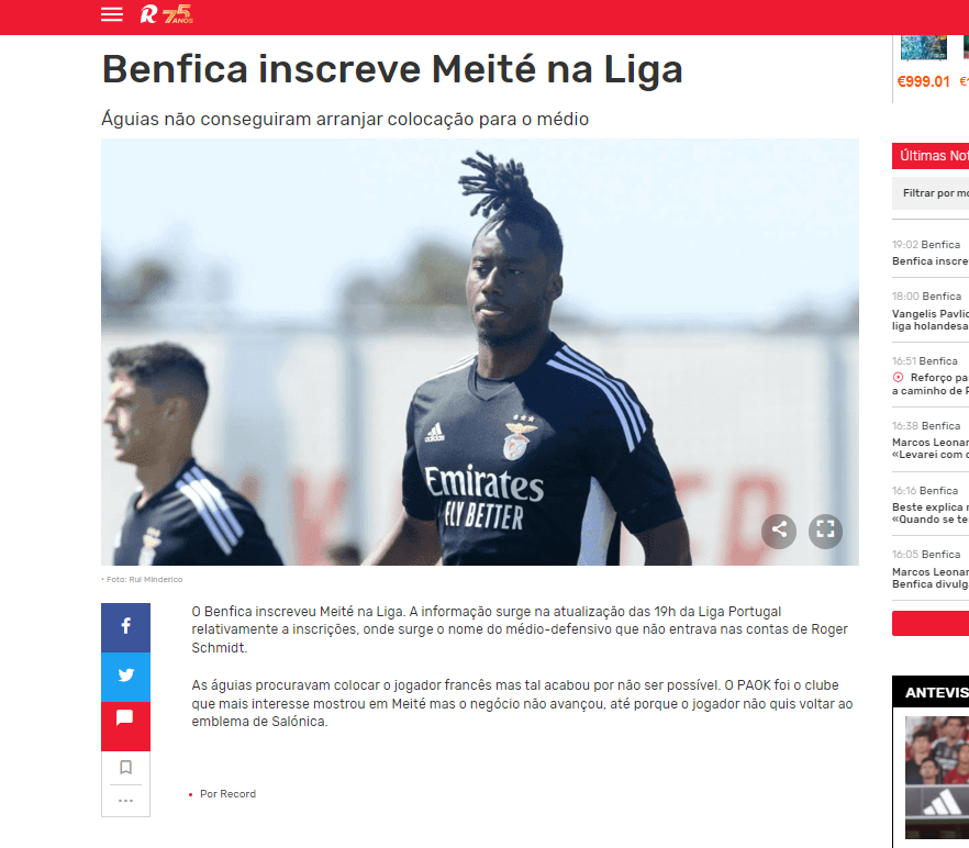 Η Μπενφίκα κατέγραψε τον Μεϊτέ στη Λίγκα. Η πληροφορία προκύπτει από την ενημέρωση των 19:00 της Liga Portugal σχετικά με τις εγγραφές, όπου εμφανίζεται το όνομα του αμυντικού μέσου που δεν υπολογιζόταν από τον Ρότζερ Σμιντ.