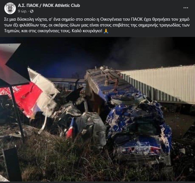 “Σε μια δύσκολη νύχτα, σ’ ένα σημείο στο οποίο η Οικογένεια του ΠΑΟΚ έχει θρηνήσει τον χαμό των έξι φιλάθλων της, οι σκέψεις όλων μας είναι στους επιβάτες της σημερινής τραγωδίας των Τεμπών, και στις οικογένειες τους. Καλό κουράγιο”