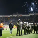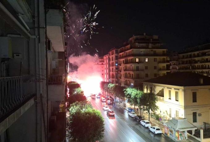 Φίλοι του Δικεφάλου συγκεντρώθηκαν στο κέντρο της Θεσσαλονίκης και έκαναν τη νύχτα μέρα με τα καπνογόνα που άναψαν, στήνοντας ένα μεγάλο πάρτι.