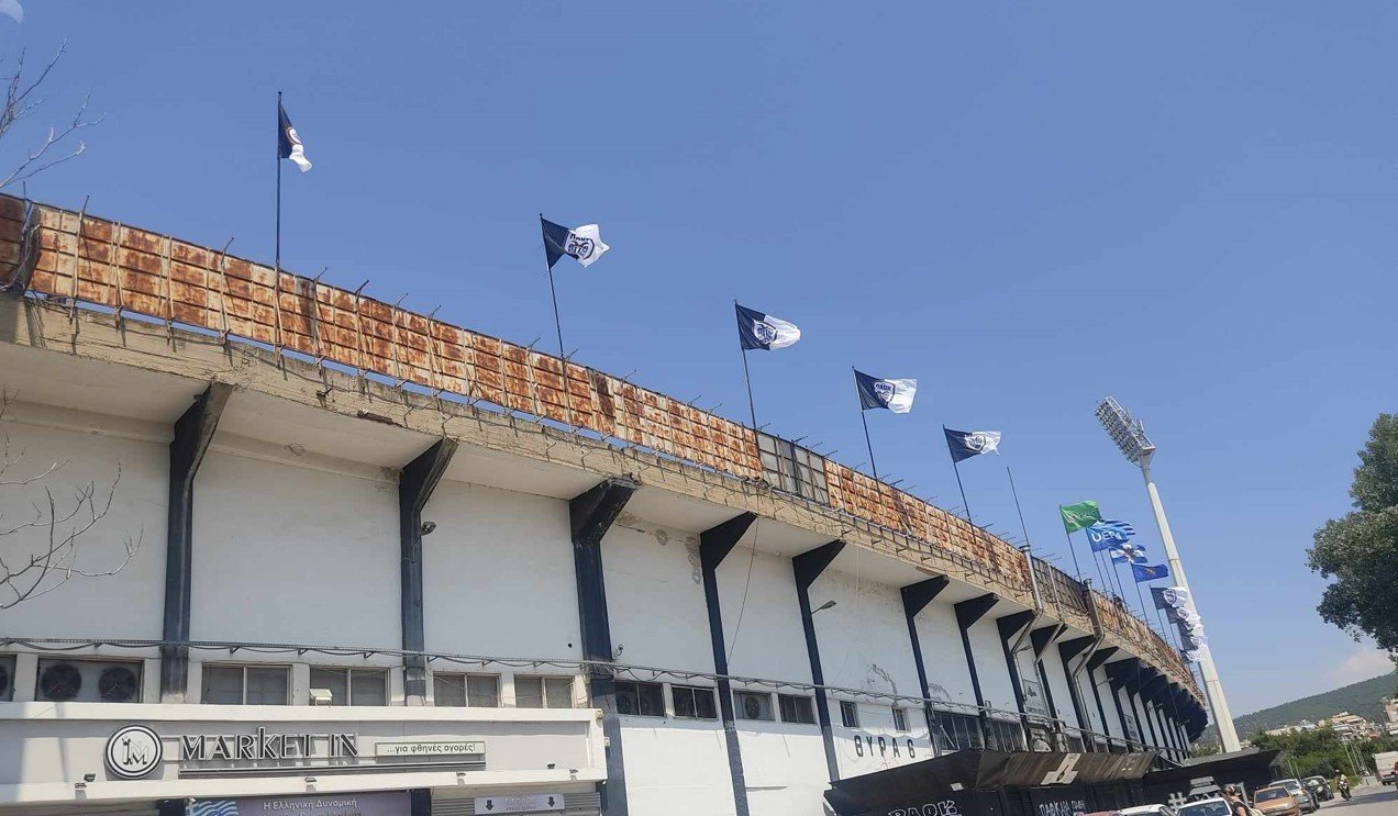 Μέχρι στιγμής έχουν αντικατασταθεί όλες οι σημαίες στις θύρες 5, 6 και 7, ενώ οι εργασίες θα συνεχιστούν και αύριο προκειμένου να αλλάξουν και στις υπόλοιπες θύρες του γηπέδου.