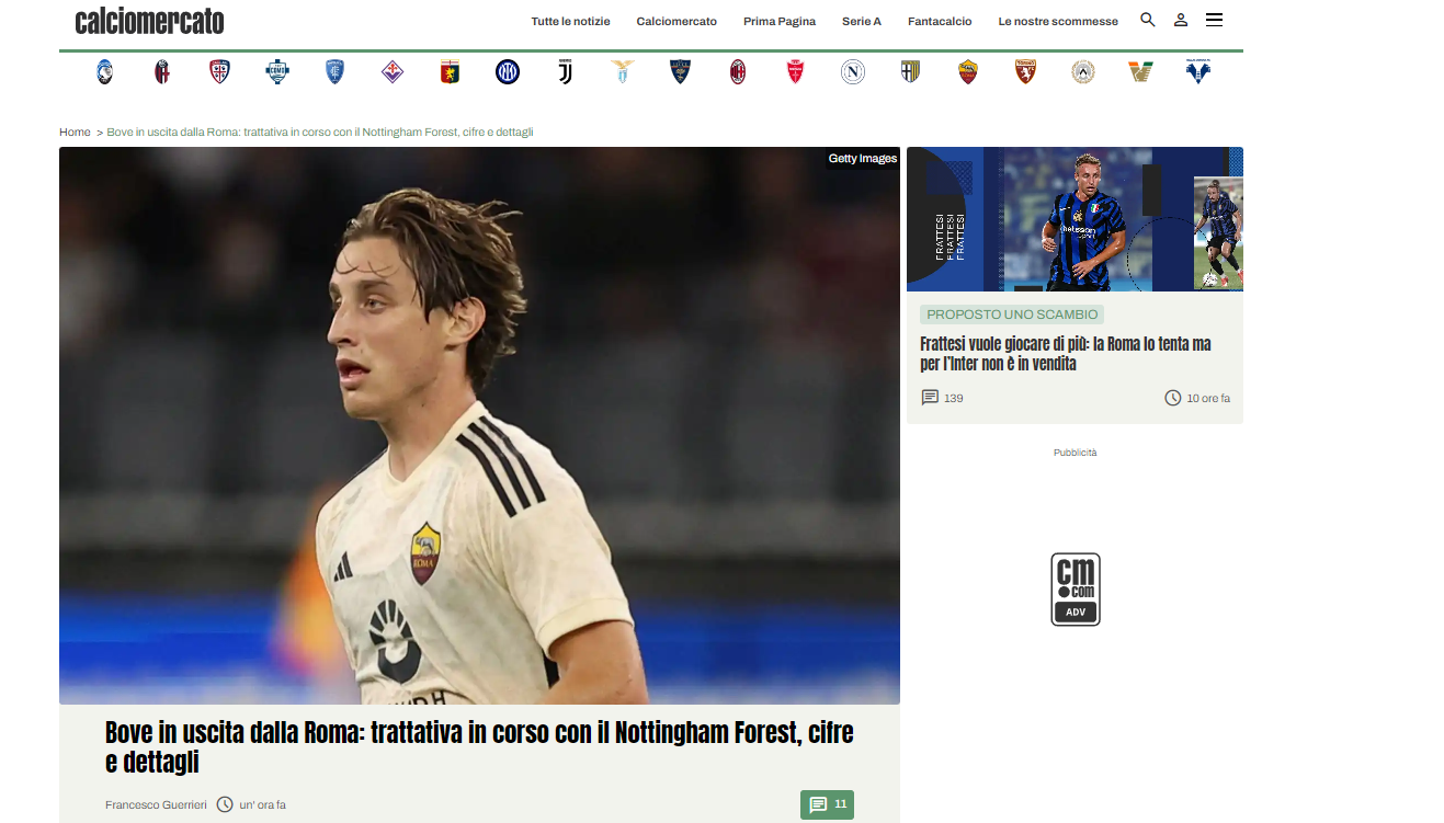 Σύμφωνα με το Calciomercato, η Ρόμα βρίσκεται σε διαπραγματεύσεις με τη Νότιγχαμ Φόρεστ για την πώληση του Έντοαρντο Μποβέ. Η ομάδα της Ρώμης δεν θεωρεί πλέον τον Μποβέ βασικό στα πλάνα της, ειδικά μετά την άφιξη του Λε Φε και την πιθανή αλλαγή ρόλου του Μπαλντάντζι. Παράλληλα, ενδιαφέρον για τον παίκτη είχε δείξει και ο ΠΑΟΚ, χωρίς να καταθέσει επίσημη πρόταση.