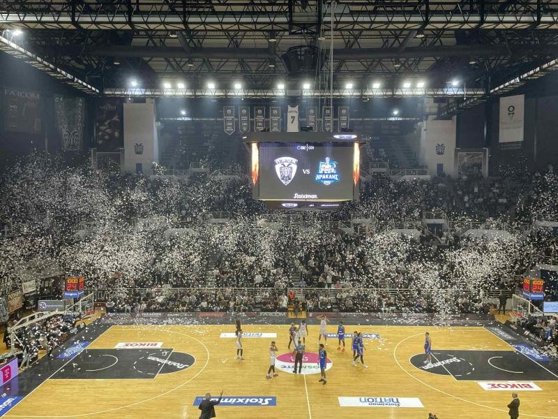 Στο τζάμπολ της αναμέτρησης, χιλιάδες χαρτάκια κάλυψαν τον αγωνιστικό χώρο, θυμίζοντας τις εντυπωσιακές στιγμές των περσινών τελικών με την Μπιλμπάο για το FIBA Europe Cup, ενώ οι φίλαθλοι κατέκλυσαν όλες τις κερκίδες του γηπέδου.