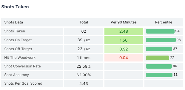 Συγκεκριμένα θα δούμε τους αριθμούς που έχει στις  παρακάτω κατηγορίες: Γκολ και xG (Expected Goals), Σουτ, Ασίστ, Πάσες και Δημιουργία Ευκαιριών, Ντρίμπλες και Οφσάιντ, Κίτρινες Κάρτες, Κόκκινες Κάρτες και Φάουλ, Αμυντικά Στατιστικά, και Στατιστικά Πέναλτι.