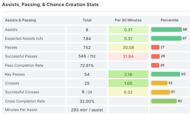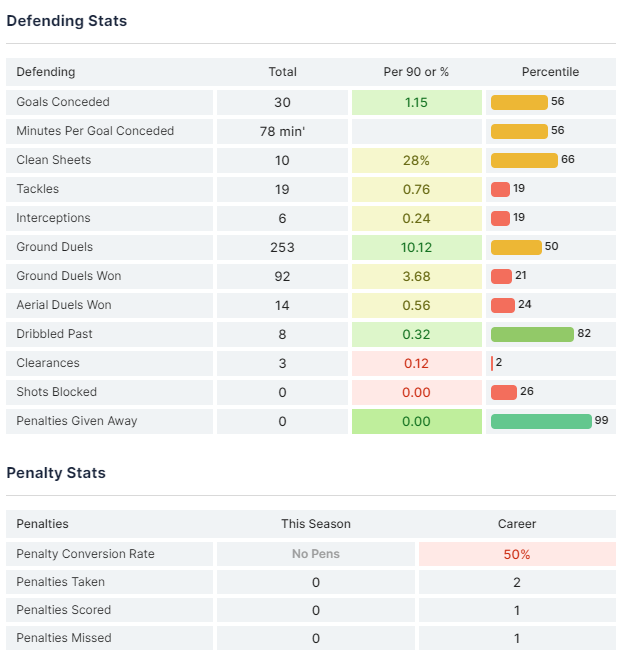 Αμυντικά, έχει δεχτεί 5 κίτρινες κάρτες και κάνει 1.24 φάουλ ανά 90 λεπτά. Στα πέναλτι, έχει εκτελέσει 2, με ποσοστό επιτυχίας 50%.