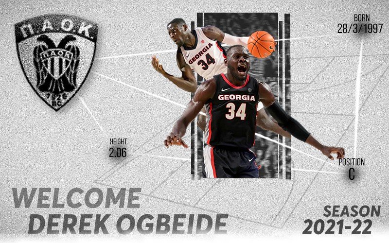 Η ΚΑΕ ΠΑΟΚ ανακοινώνει την συμφωνία με τον καλαθοσφαιριστή Derek Ogbeide. Ο 24χρονος σέντερ με καταγωγή από τη Νιγηρία, αλλά και Αμερικανική υπηκοότητα, θα υπογράψει συμβόλαιο ενός έτους με την ομάδα μας και είναι ο πρώτος παίκτης που προστίθεται στο ρόστερ του ΠΑΟΚ για την αγωνιστική περίοδο 2021-22.