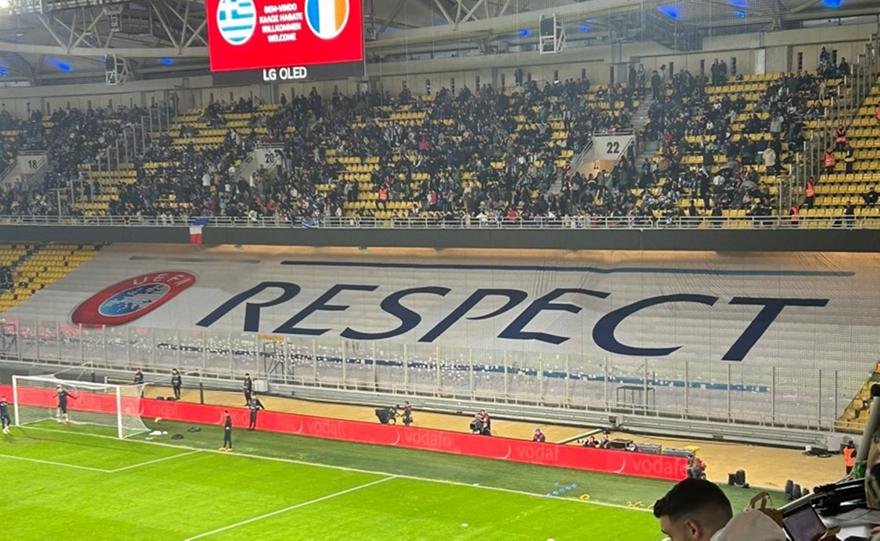 Grande bâche de l’UEFA qui va réduire la capacité du stade à Athènes ce soir à 26000 pour éviter que les supporters des autres clubs ne viennent détériorer le Kop de ceux de l’AEK #GREFRA pic.twitter.com/WmzLSMRQ0P