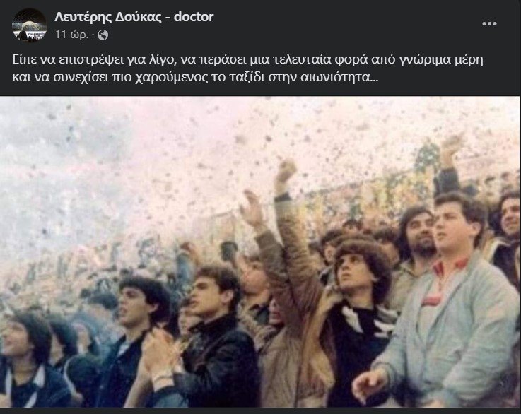 O υπεύθυνος επικοινωνίας της ΠΑΕ ΠΑΟΚ, Λευτέρης Δούκας μετά το τέλος του αγώνα με τον Άρη δεν ξέχασε τον Μάκη “Μανάβη” ιστορικό αρχηγό της Θύρας 4 και του αφιέρωσε τη νίκη με μία συγκινητική ανάρτηση