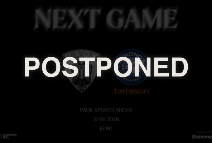 Μετά από αίτημα της ΚΑΕ ΠΑΟΚ, το οποίο έγινε δεκτό από την Stoiximan GBL, αναβάλλεται ο αγώνας ΠΑΟΚ – Μύκονος Betsson, που ήταν προγραμματισμένος να διεξαχθεί το Σάββατο 31 Ιανουαρίου 2026.