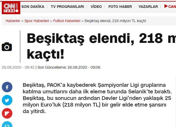 Στο σημερινό τύπο της Τουρκίας οι λέξεις “σοκ” και “καταστροφή” κυριαρχούν για τον χθεσινό αποκλεισμό της Μπεσίκτας από τον ΠΑΟΚ από την συνέχεια του Champions League.