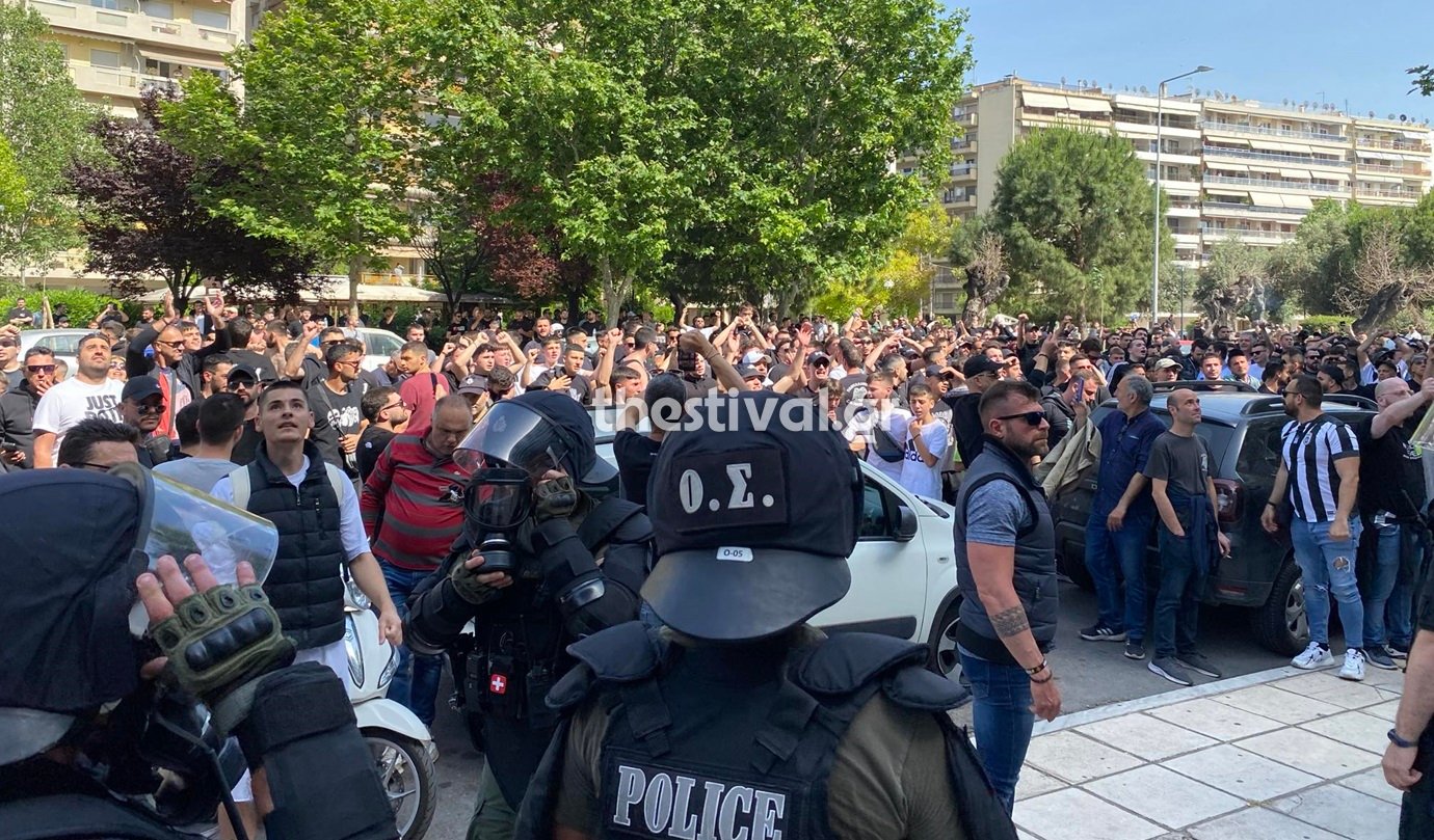 Οι “ασπρόμαυροι” οπαδοί συγκεντρώθηκαν έξω από το ξενοδοχείο που διανυκτέρευσε η αποστολή του ΠΑΟΚ και φώναξαν συνθήματα για να τους εμψυχώσουν, λίγες ώρες πριν το ντέρμπι τίτλου με τον Άρη στο “Κλεάνθης Βικελίδης“.