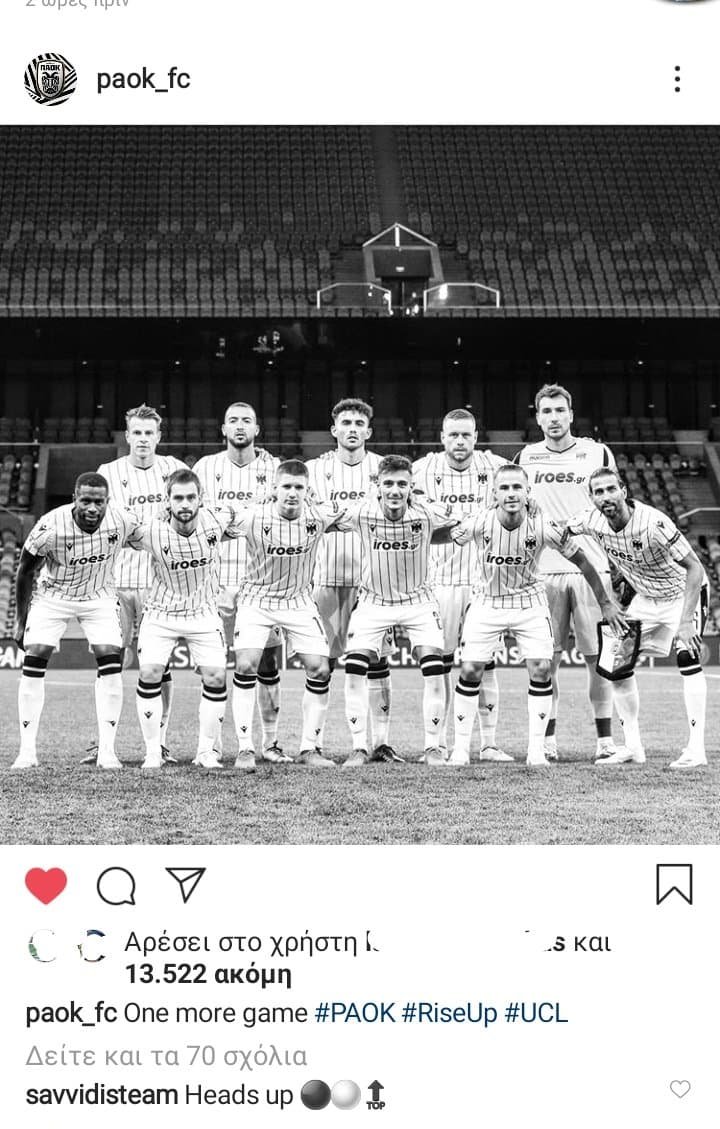 Η ΠΑΕ ΠΑΟΚ δημοσίευσε στον επίσημο λογαριασμό instagram  μια φωτογραφία από  την ενδεκάδα του χθεσινού αγώνα κόντρα στην Κράσνονταρκαι από κάτω το μέλος του Δ.Σ. της ΠΑΕ  ΠΑΟΚ,Γιώργης Σαββίδης σχολίασε:”Ψηλά το κεφάλι”.
