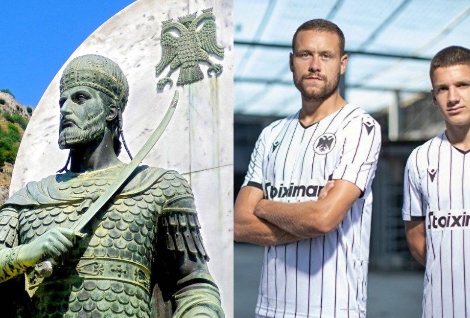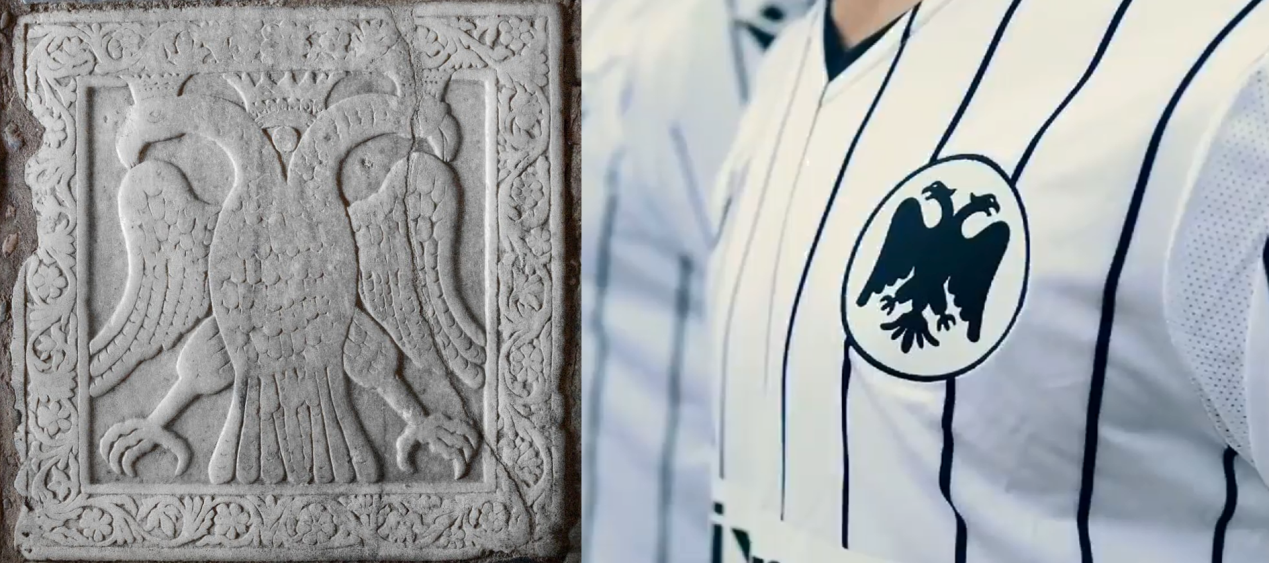 Ο Δικέφαλος αετός των Παλαιολόγων στον μητροπολιτικό ναό του Αγίου Δημητρίου στον Μυστρά (αριστερά) και η φετινή δεύτερη επίσημη εμφάνιση του ΠΑΟΚ (δεξιά).