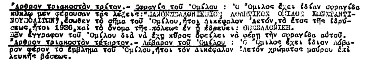 Άρθρον τριακοστόν τρίτον. – Σφραγίς του Ομίλου: Ο Όμιλος έχει ιδίαν σφραγίδα κύκλω μεν φέρουσαν τας λέξεις: «ΠΑΝΘΕΣΣΑΛΟΝΙΚΕΙΟΣ ΑΘΛΗΤΙΚΟΣ ΟΜΙΛΟΣ ΚΩΝΣΤΑΝΤΙΝΟΥΠΟΛΙΤΩΝ», έσωθεν το σήμα του Ομίλου, ήτοι Δικέφαλον Αετόν, το έτος της ιδρύσεως, ήτοι 1926, και το όνομα της πόλεως εν η εδρεύει: ΘΕΣΣΑΛΟΝΙΚΗ.