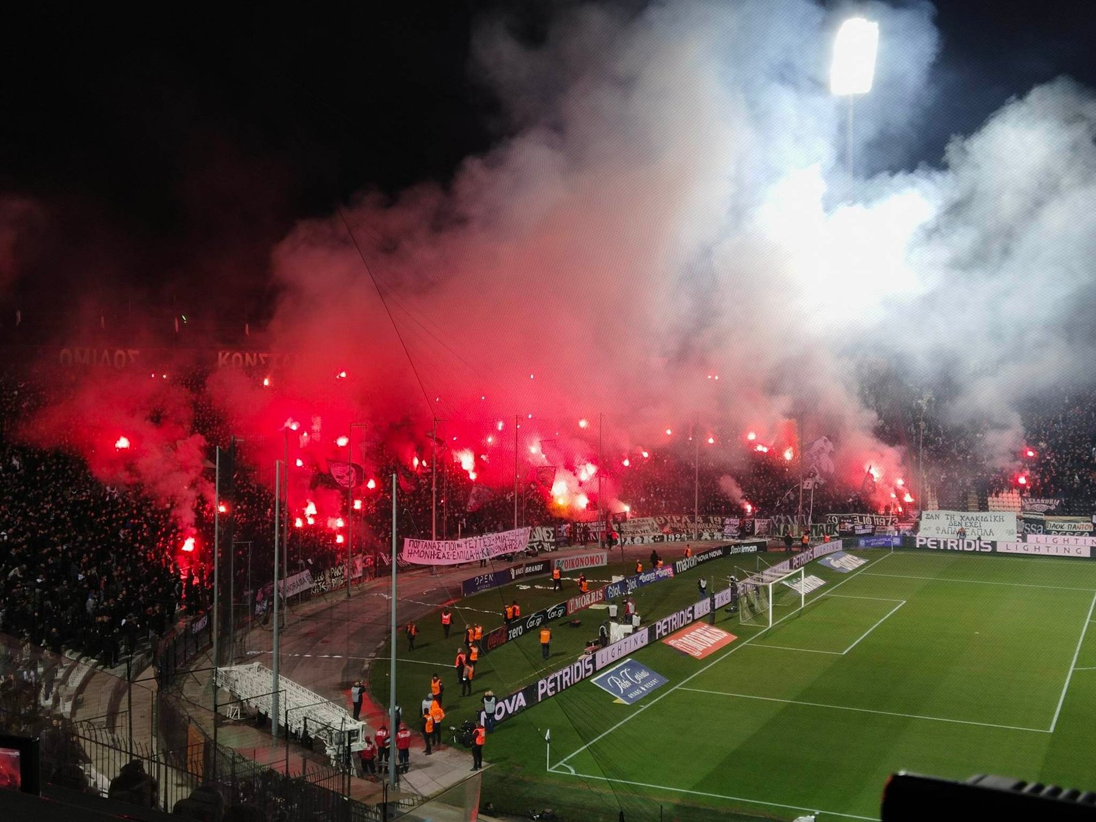 “Καυτή” ατμόσφαιρα δημιούργησαν οι φίλοι του ΠΑΟΚ που είναι στις κερκίδες του γηπέδου της Τούμπας κατά την είσοδο των ομάδων στον αγωνιστικό χώρο για την έναρξη του αγώνα κόντρα στον Άρη για την 16η αγωνιστική του πρωταθλήματος της Super League.