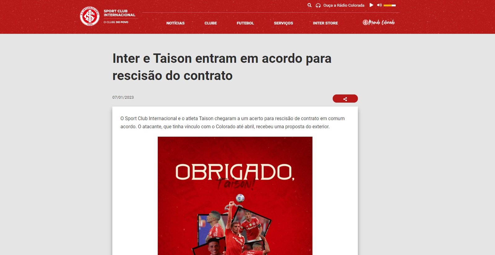 Η Ίντερνασιονάλ πριν από λίγο εξέδωσε ανακοίνωση με την οποία ενημερώνει για την κοινή συναινέσει λύση της συνεργασίας της με τον Βραζιλιάνο, Τάισον.