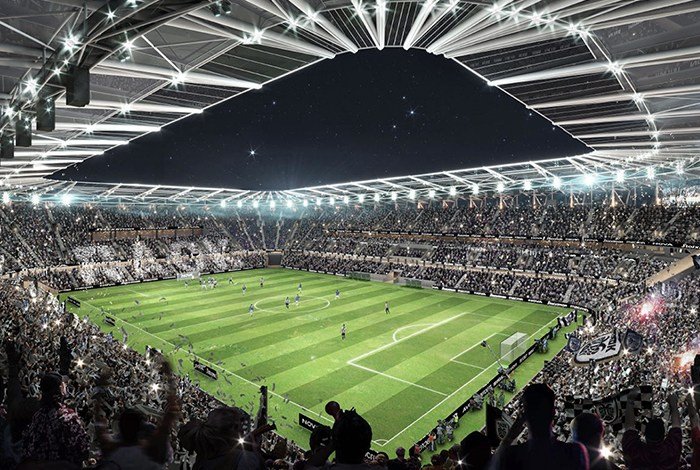 Tρισδιάστατη τομή δυτικής κερκίδας (η πλατεία, που αγκαλιάζει όλο το γήπεδο, η μπουτίκ, το υπόγειο πάρκινγκ, τα επίπεδα φιλοξενίας).