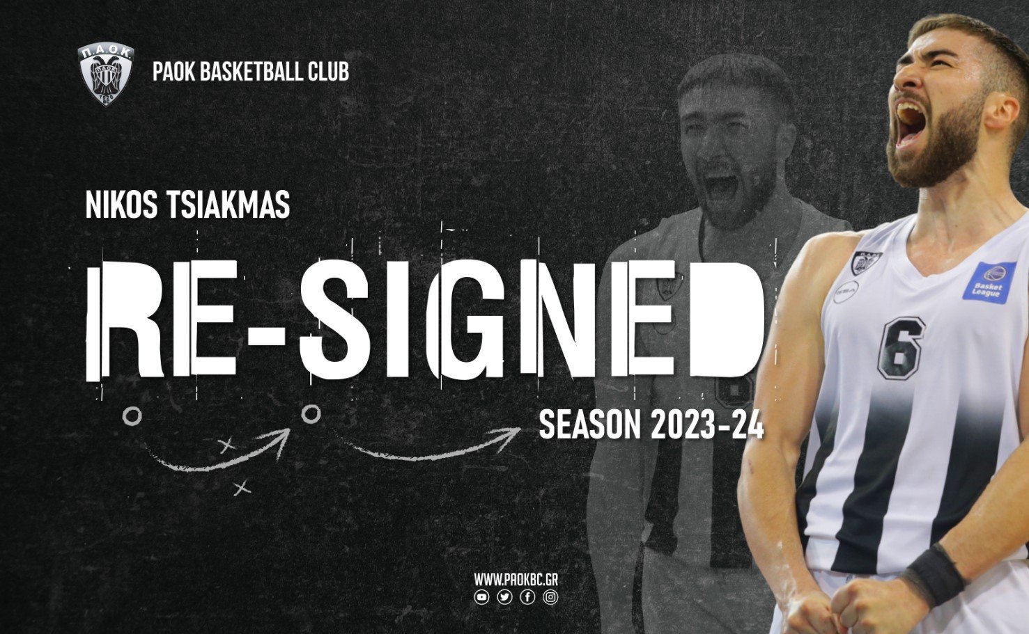 Η ΚΑΕ ΠΑΟΚ ανακοινώνει την συμφωνία με τον καλαθοσφαιριστή Νίκο Τσιακμά, ο οποίος θα αγωνιστεί με τα ασπρόμαυρα για την αγωνιστική περίοδο 2023-24, ανανεώνοντας τη συνεργασία του με την ομάδα μας για μία ακόμη χρονιά!