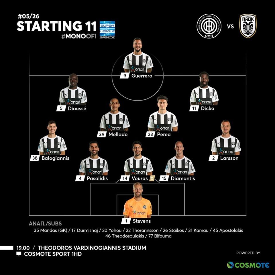 Πριν από λίγο έγινε γνωστή η ενδεκάδα που επέλεξε ο τεχνικός του ΟΦΗ, Νίκος Νιόπλιας για τον εντός έδρας αγώνα με τον ΠΑΟΚ για την 5η αγωνιστική του πρωταθλήματος της Super League.