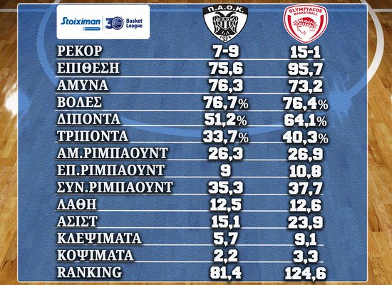 Με αυτό το αποτέλεσμα ο Ολυμπιακός έχει πια υπερδιπλάσιο αριθμό νικών από εκείνον του ΠΑΟΚ Mateco από καταβολής Α’ Εθνικής αν και στα ματς της Θεσσαλονίκης η κατάσταση είναι πιο ισορροπημένη…