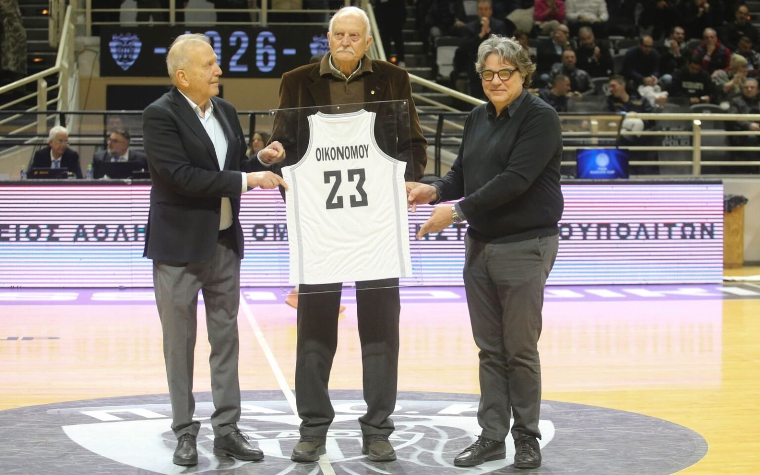 Ήταν μία ιδιαίτερα έντονη και φορτισμένη συναισθηματικά στιγμή. Ο Γιώργος Οικονόμου, με κορμοστασιά που ξεχωρίζει ακόμη και τώρα, σηκώθηκε από τη θέση του και κατευθύνθηκε προς το κέντρο του γηπέδου. Ο πρόεδρος της ΚΑΕ ΠΑΟΚ Νίκος Βεζυρτζής τον αγκάλιασε και μαζί με τον Διευθύνοντα Σύμβουλο κ.Ιωάννη Πετμεζά τίμησαν το Γιώργο Οικονόμου για την τεράστια προσφορά του στον ΠΑΟΚ. Μία προσφορά που είναι ανεκτίμητη, διότι καταγράφηκε σε εποχές δύσκολες, όταν το μπάσκετ ήταν ακόμη στην αφάνεια, δεν υπήρχε η υπερπροβολή των μέσων κοινωνικής δικτύωσης και οι εικόνες που διασώθηκαν και είναι διαθέσιμες μέχρι σήμερα είναι ελάχιστες.