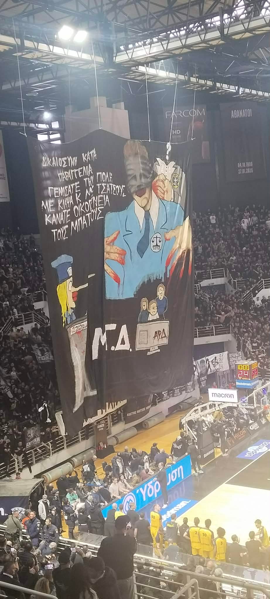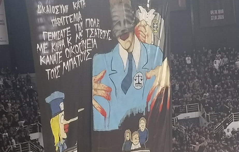 Το μήνυμα ανέφερε μεταξύ άλλων «Δικαιοσύνη κατά παραγγελία…», αφήνοντας αιχμές για την υπόθεση της δολοφονίας του Κλεομένη. Το πανό τοποθετήθηκε σε εμφανές σημείο μπροστά από την εξέδρα, δίνοντας ξεκάθαρο στίγμα πριν την έναρξη της αναμέτρησης.