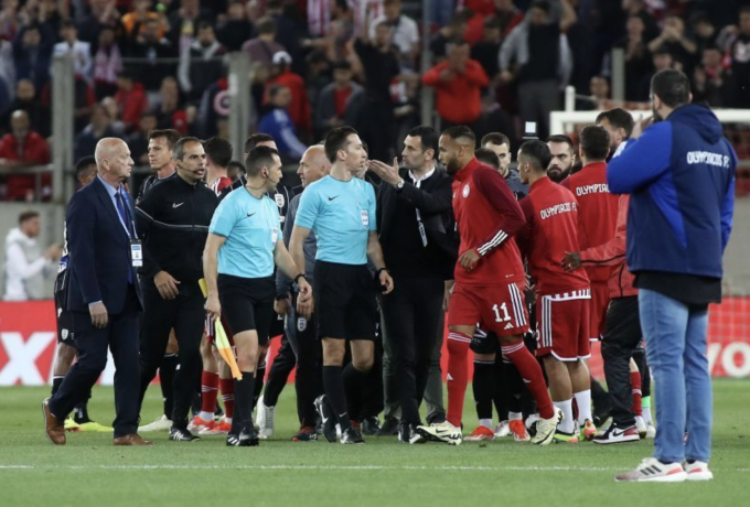 Στο 27′, ο Ολυμπιακός επιχείρησε να κάνει το ίδιο. Αυτή τη φορά ο Ναβάρο κατέβασε τη μπάλα, ο Κουλιεράκης είχε μια απλή επαφή με τον παίκτη του Ολυμπιακού κι ο διαιτητής υπέδειξε πέναλτι, σε παράβαση που θα δινόταν μόνο σε αγώνα μπάσκετ.