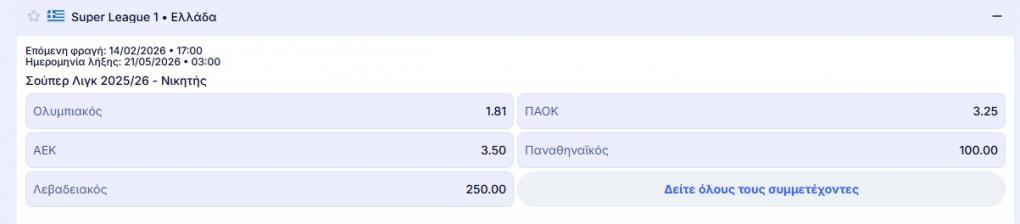 Μπορεί η βαθμολογία να παρουσιάζει συνεχείς ανακατατάξεις, ωστόσο οι αποδόσεις συνεχίζουν να σκιαγραφούν με σαφήνεια το τοπίο στη μάχη για τον τίτλο. Ο ΠΑΟΚ παραμένει σταθερά μέσα στο κάδρο των διεκδικητών, με τους αριθμούς να επιβεβαιώνουν ότι η φετινή Super League εξελίσσεται σε κούρσα λεπτών ισορροπιών.