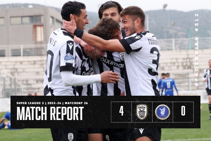 Άνετη νίκη για τον ΠΑΟΚ Β επί της Νίκης Βόλου, την οποία κέρδισε 4-0 στο τελευταίο ματς της κανονικής διάρκειας του πρωταθλήματος της Super League 2. Λόγω της ισοπαλίας του Μακεδονικού με την ΑΕΚ Β ωστόσο, ο Δικέφαλος θα συνεχίσει πλέον στα play outs.