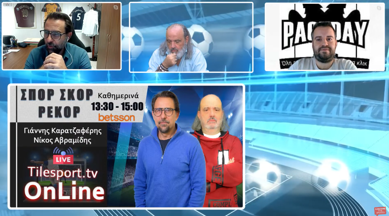 Ο δημοσιογράφος του PAOKDAY, Στέλιος Παπαντωνίου μετέφερε τα τελευταία του ΠΑΟΚ στο Tilesport. tv στο youtube και στην εκπομπή “ΣΠΟΡ ΣΚΟΡ ΡΕΚΟΡ ” με τους Γιάννη Καρατζαφέρη και Νίκο Αβραμίδη.