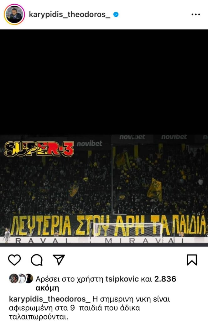 Συγκεκριμένα ο ισχυρός άντρας της “κιτρινόμαυρης” ΠΑΕ δημοσίευσε μια φωτογραφία από το πανό που ανέβηκε στο “Κλ. Βικελίδης” και γράφει “λευτεριά στου Άρη τα παιδιά“ και έγραψε ως λεζάντα “Η σημερινή νίκη είναι αφιερωμένη στα 9 παιδιά που άδικα ταλαιπωρούνται”.