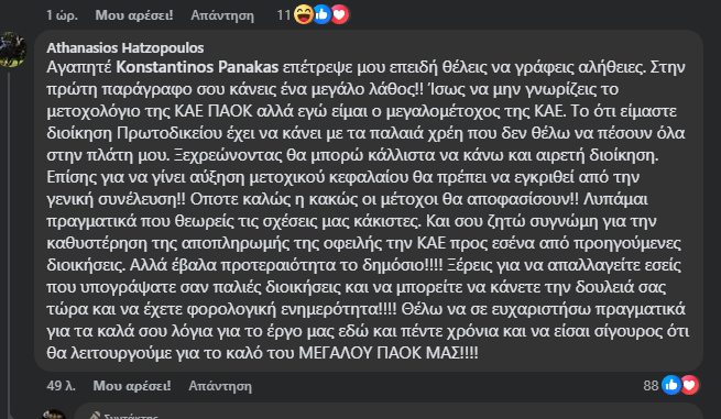 «Αγαπητέ Κωνσταντίνε Πανάκα επέτρεψε μου επειδή θέλεις να γράφεις αλήθειες. Στην πρώτη παράγραφο σου κάνεις ένα μεγάλο λάθος!! Ίσως να μην γνωρίζεις το μετοχολόγιο της ΚΑΕ ΠΑΟΚ αλλά εγώ είμαι ο μεγαλομέτοχος της ΚΑΕ.
