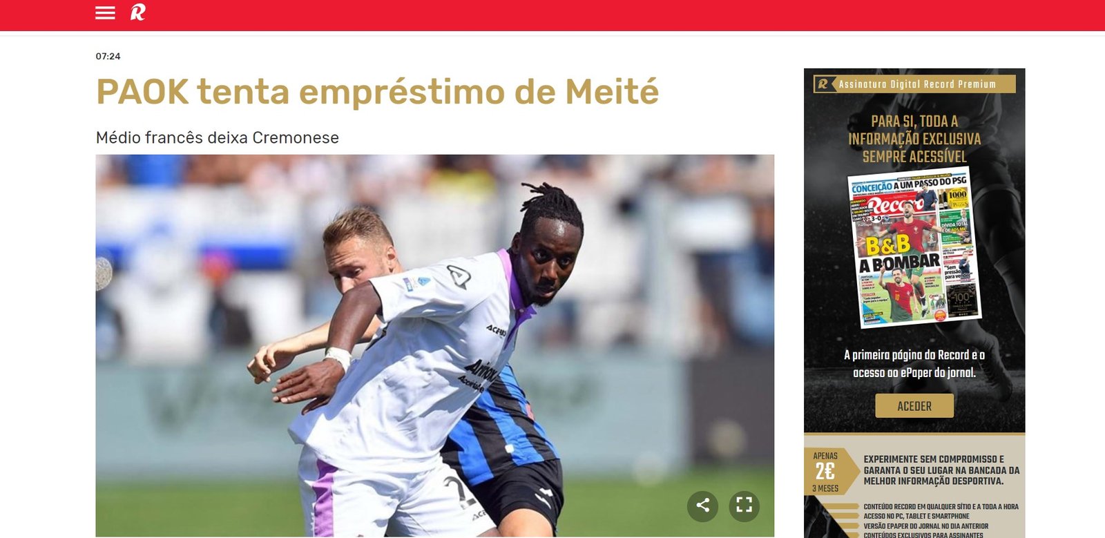 «Ο ΠΑΟΚ προσπαθεί να αποκτήσει με την μορφή δανεισμού τον Σουαλίχο Μεϊτέ, ο οποίος δόθηκε δανεικός στην Κρεμονέζε το 2022/23 και ανήκει στην Μπενφίκα. Ο ιταλικός σύλλογος, που υποβιβάστηκε στη Serie B, ξεκαθάρισε κατά την διάρκεια της χθεσινής ημέρας την απόφαση να μην ενεργοποιήσει την οψιόν αγοράς του 29χρονου Γάλλου μέσου λόγω του υποβιβασμού».