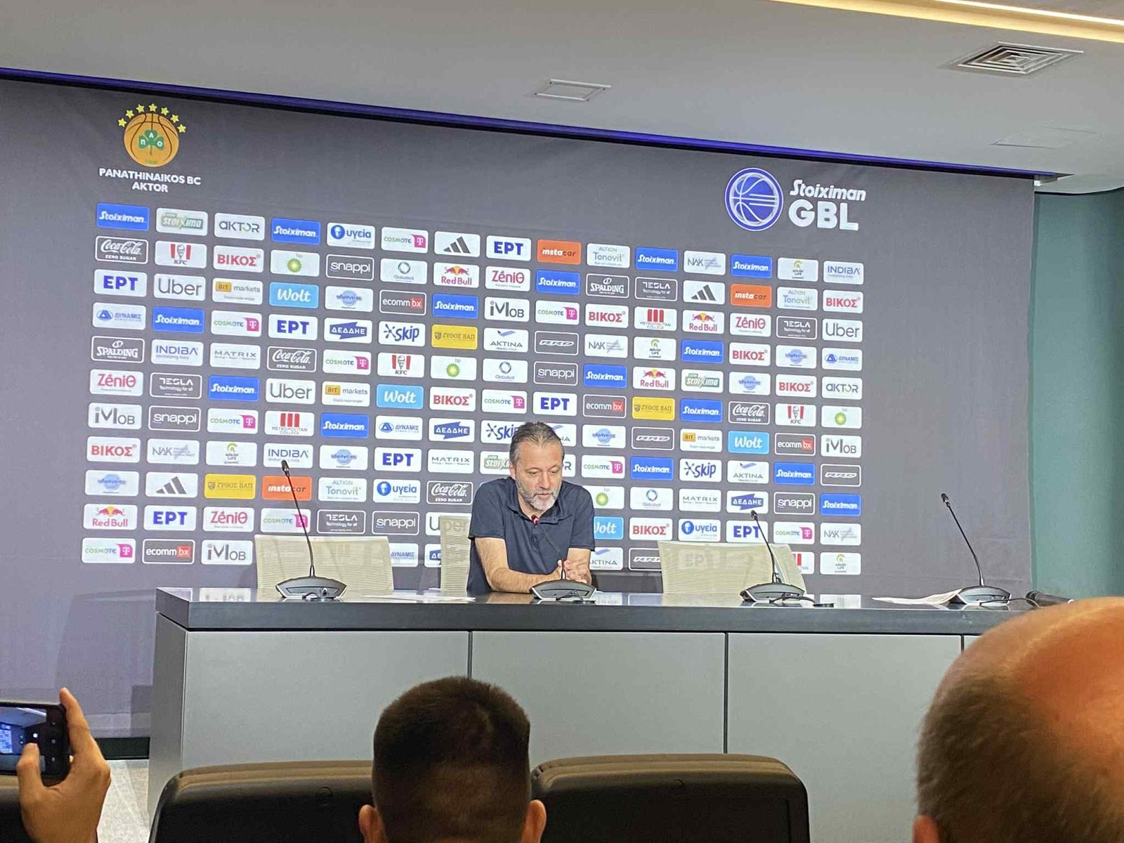 Για το πόσο εύκολο είναι να μείνει αήττητη η ομάδα: «Δεν είναι εύκολο να είσαι αήττητος σε ένα πρωτάθλημα, όποιο και αν είναι. Ειδικά όταν παίζει και ο Ολυμπιακός που διεκδικεί την Ευρωλίγκα. Αλλά δεν είναι και το πιο σημαντικό. Ήμασταν πέρσι, τα πρώτα παιχνίδια που χάσαμε όμως ήταν στους τελικούς και δεν πήραμε το πρωτάθλημα. Άρα, αυτό που μετράει όλη τη σεζόν και στους τρεις στόχους είναι πως θα βρισκόμαστε… Εφόσον πάμε στον τελικό του κυπέλλου την περίοδο που θα γίνει ο τελικός του κυπέλλου, και πώς θα τελειώσουμε τη σεζόν, σε τι κατάσταση θα είμαστε για να πετύχουμε τους στόχους μας. Αλλά είναι πάρα πολύ μακριά όλα αυτά. Η ομάδα μας δεν μπορεί να κοιτάξει τίποτα παρά τις επόμενες μέρες της προπόνησης, ούτε καν τον επόμενο αγώνα. Γιατί και χωρίς να αποτελεί δικαιολογία θα το πω ακόμη μία φορά, επειδή είναι αρχή το λέμε, είναι ελλιπέστατη η προετοιμασία που έχουμε κάνει. Αυτό φαίνεται ξεκάθαρα και στους νέους παίκτες που δεν έχουν μπει στη φιλοσοφία της ομάδας αλλά και στους παλιούς παίκτες που την γνωρίζουν. Επίσης, μας συνέβησαν και 2-3 περιστατικά, όπως η σοβαρή ίωση του Σορτς και του Χολμς που είναι καινούργιοι και παίκτες κλειδιά, που χάσανε και αυτοί λίγο χρόνο ακόμα. Και αυτό φαίνεται ως ομάδα ξεκάθαρα. Οπότε το πρώτο μας μέλημα είναι να καταφέρουμε να φτάσουμε σε ένα επίπεδο αμυντικά και επιθετικά που όλοι οι παίκτες θα καταλαβαίνουν τι ζητάμε, πώς θέλουμε να παίζουμε, να αυτοματοποιήσουμε την ομάδα ώστε να είμαστε πιο καλοί στην συνέχεια».