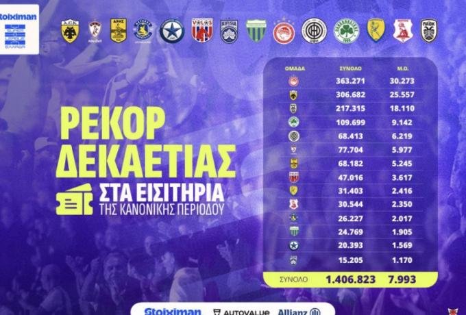 Ο φετινός μέσος όρος ξεπέρασε ακόμη και το προηγούμενο υψηλό της δεκαετίας (7.683 τη σεζόν 2023-24), δείχνοντας την ανοδική τάση του ενδιαφέροντος. Παράλληλα, η σεζόν 2022-23 παραμένει η κορυφαία σε συνολικά εισιτήρια (1.742.788).