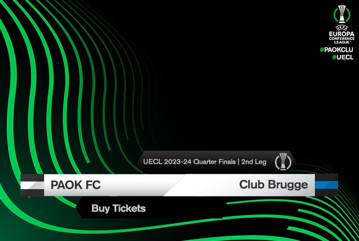 Η ΠΑΕ ΠΑΟΚ ανακοινώνει ότι την Τρίτη (16.04) στις 09:00 θα ξεκινήσει η διαδικτυακή διάθεση των εισιτηρίων του αγώνα ΠΑΟΚ-Κλαμπ Μπριζ για τα προημιτελικά του UEFA Europa Conference League 2023-24 που θα διεξαχθεί την Πέμπτη (18.04, 22:00) στο γήπεδο της Τούμπας.
