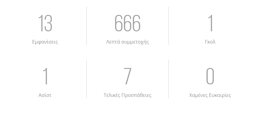 Συγκεκριμένα σε 13 συμμετοχές σε Ελλάδα και Ευρώπη μετράει ένα γκολ και μία ασίστ, ενώ έχει κάνει μόλις εφτά τελικές προσπάθειες.