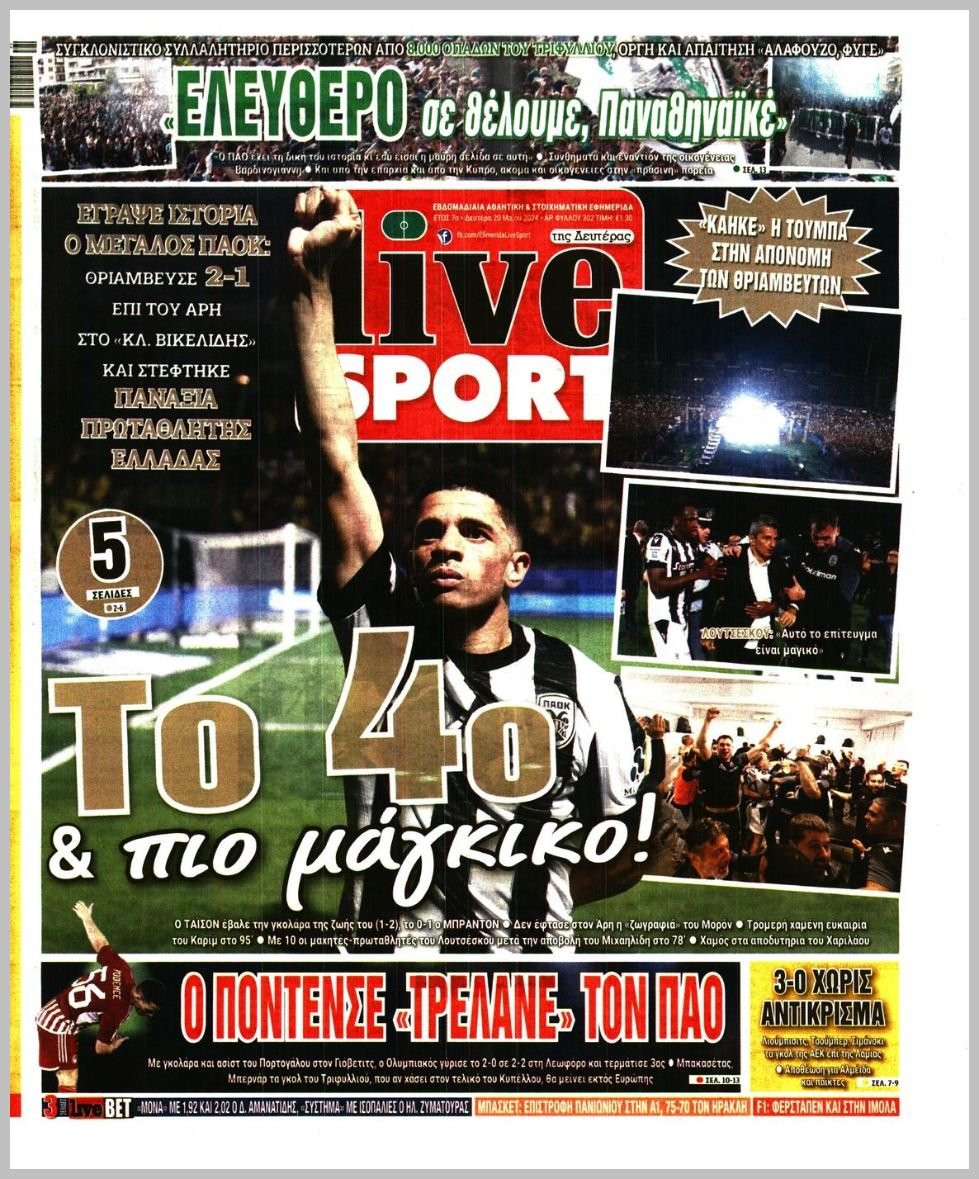 Τα σημερινά πρωτοσέλιδα των αθλητικών εφημερίδων για την ιστορική κατάκτηση του πρωταθλήματος του ΠΑΟΚ μέσα στο Κλεάνθης Βικελίδης.