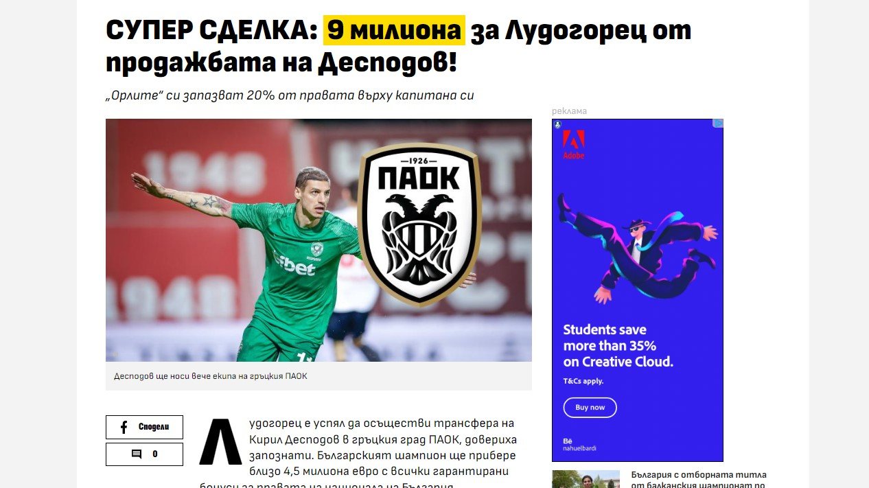 Σύμφωνα με δημοσίευμα του «telegraph.bg» το συνολικό deal του ΠΑΟΚ με τη Λουντογκόρετς είναι στα 4,5 εκατομμύρια ευρώ για το 80% του Κίριλ Ντεσπόντοφ. Δεν προκύπτει από τους Θεσσαλονικείς.