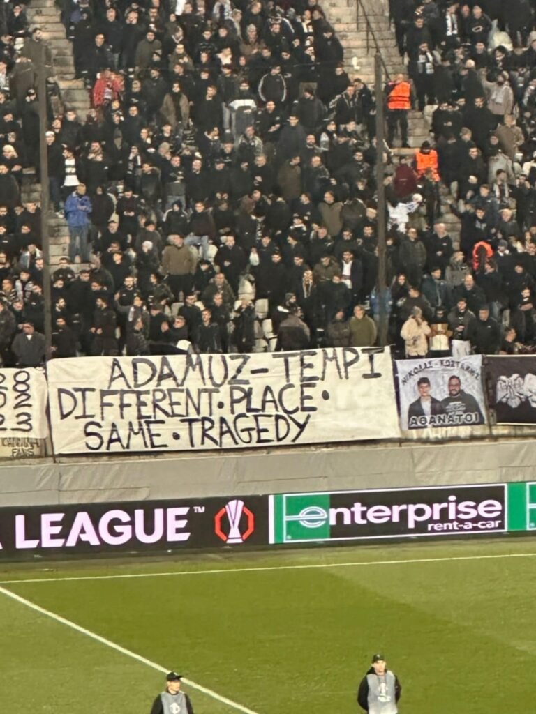 Οι φίλοι του ΠΑΟΚ τίμησαν τα θύματα της πρόσφατης τραγωδίας στην Ισπανία, υψώνοντας στο γήπεδο της Τούμπας πανό με μήνυμα: «Ανταμούζ-Τέμπη, διαφορετικό μέρος, ίδια τραγωδία». Το σιδηροδρομικό δυστύχημα στην Ανταμούζ έχει συγκλονίσει την κοινή γνώμη, με 45 νεκρούς και πάνω από 290 τραυματίες.